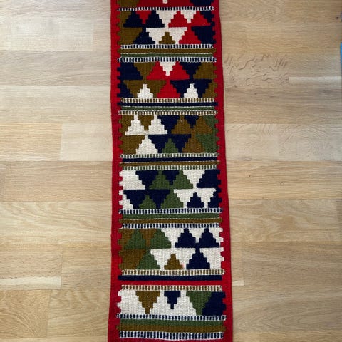 Ukjent håndlaget veggteppe med fargerikt mønster laget av ull. Har en trepinne bak til oppheng.