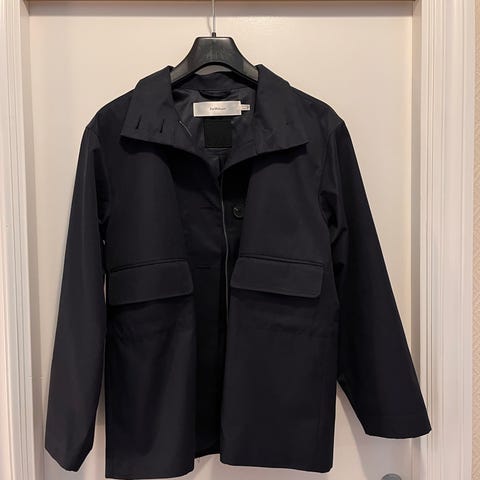 Jakken har belte og knappelukking, foret innside med glatt materiale