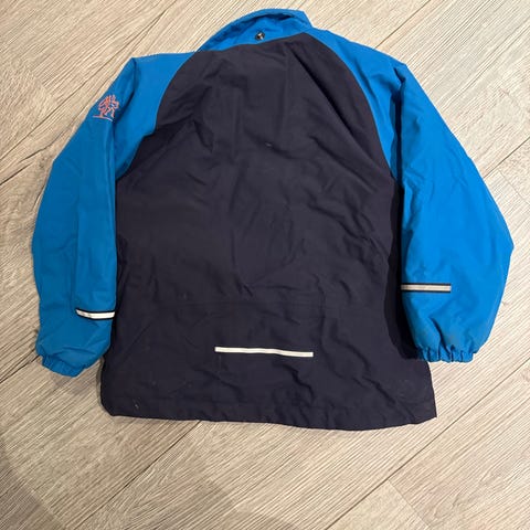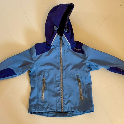 Bergans Barnejakke i størrelse 98, farge blå, designet for unisex barn. Jakken har hette og lommer, med detaljer i mørk blå og lyseffekter. Egnet for utendørs bruk og beskytter mot vær.