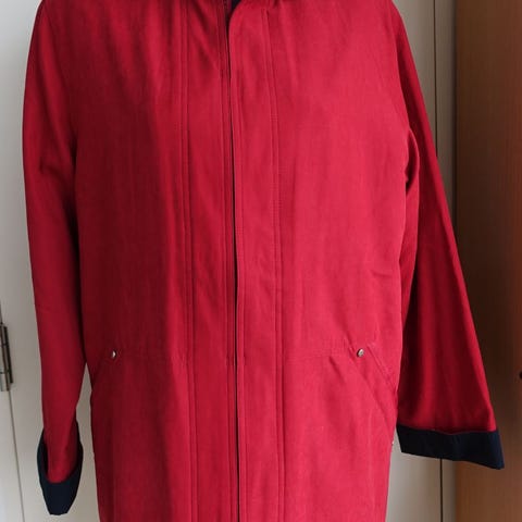 Nesten ikke brukt, hengt I klespose innerst I klesskapet og glemt, rygglengde 85 cm, rød oppbrett på ermene, hetta har rødt for inni,Jakken lukkes med glidelås og knapper/ glidelås er skult. 2 lommer i front, en innelomme med knapp. Selges kr.200 .Sender med posten fra postkontoret eller hentes NB Sender ikke med Fiks ferdig, da jeg har blitt lurt før