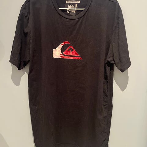 Blå turkis Quiksilver T-skjorte, tror størrelsen er 16, dvs tilsvarer en small kvinne, XS mann. Mye brukt og avfarget under armene, priset deretter