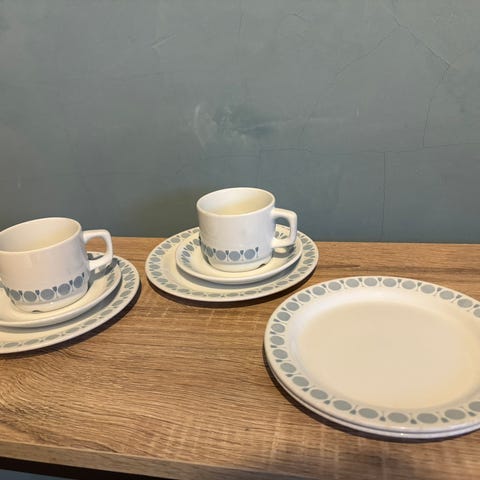 Fem små kopper med fat, två store kopper med et fat, en sukkerskål