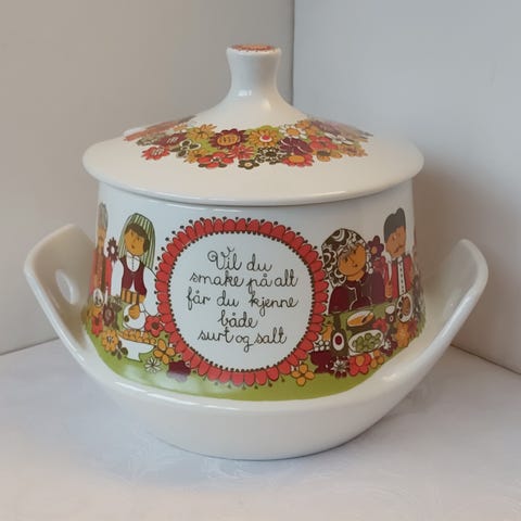 Mangler burgunder lokk til liten ildfast terrin fra Figgjo "Flamingo" - tilsvarnede den store store terrinen med burgunder lokk på bildet.