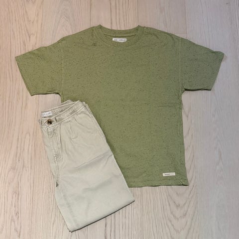 Liten klespakke bestående av tåke blå Zara True Neutrals t-skjorte i lin og bomull og tåke blå linbukse i 100% lin fra Zara, str. 134-140 / 9-10 år, trøya er helt ny med lappen på og buksa er brukt en gang, selges samlet kr. 329,-. Hentes Lillehammer. Kan også sendes mot at kjøper dekker porto.