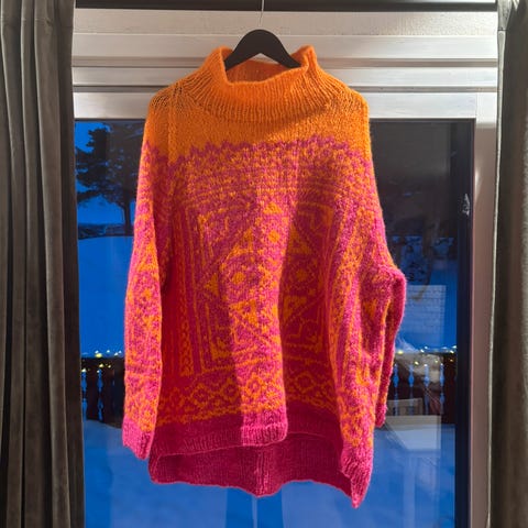 Strikkete gensere for dame i størrelse M. Laget av ull med mønster. Skappelgenseren kr 1900 de andre kr 1600