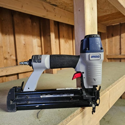 Basso dykk spikerpistol levert med blå oppbevaringsboks.