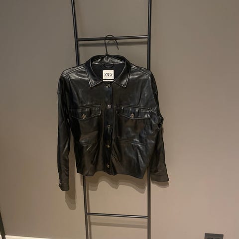 Super kul skinnjakke fra Zara i str xs. Lite og pent brukt, men er litt slitt i nakken (se bilde nr 3) og selges derfor noe billigere, men ellers veldig fin!