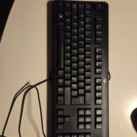 Razer BlackWidow 2014 tastatur med USB-tilkobling og lydporter. Tastaturet har standard norsk layout og er designet for bruk med PC. Kabelen inkluderer USB og lydkontakter for hodetelefon og mikrofon.