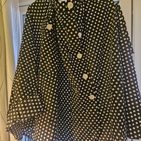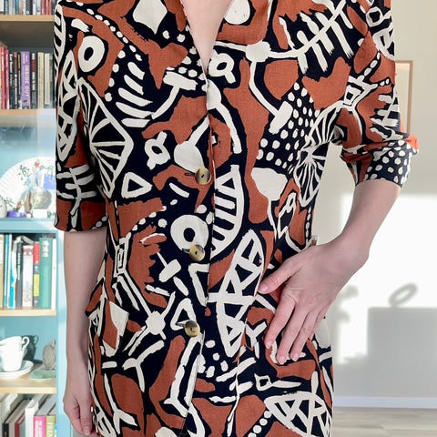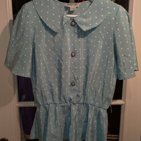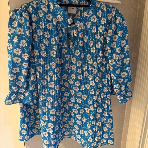 Selger en arvet, pen åpen bluse fra Anna Liisa Buur. Kan knytes i livet, med noen små beskjedne skulderputer.
