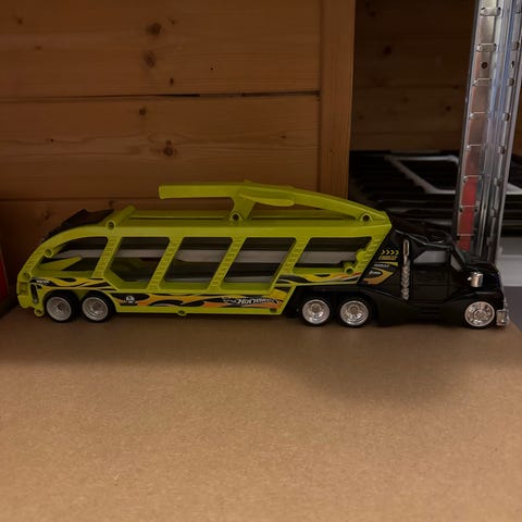 Hot Wheels lekebil i rødt og svart plastmateriale. Passer for barn som leker med små biler. Modellen har detaljer som et beskyttende bur og en blå spoiler bak.