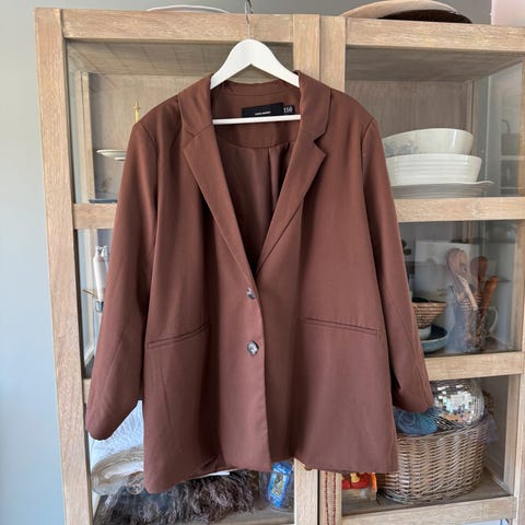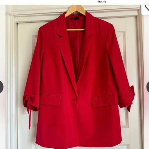 Nydelig mørk-rød dame overdel (åpen lang blazer)- sjelden pen modell, som jeg bestilt som individual design fra moda atelje, smart design-figure ser slank og høy ut! I størrelse 42-44. Jakken er uforet, har en åpen front med et draperende design og 3/4 ermer. Den har lommer på sidene og er laget i et mykt og superstretch polyester stoff. Jakken passer til hverdagsbruk og fest , og kan kombineres med ulike antrekk. Ligger ubrukt i skap fra pandemien tid og må selges slik blir for trangt for meg. Pris kan diskuteres. Sendes!