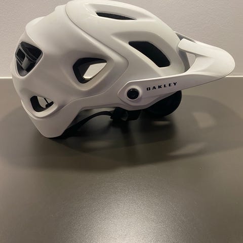 Pent brukt Oakley DRT5 MIPS sykkelhjelm i størrelse small 52-56cm, hvit. Hjelmen har flere ventilasjonsåpninger og feste for solbrilller.