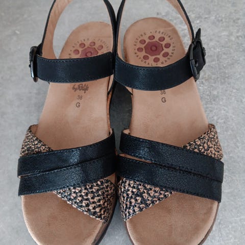 Sorte sandaler med elastisk rem rundt ankelen, så de tilpasser seg. Litt "glam" i form av stener, som gjør dem til litt mer enn vanlige sandaler!