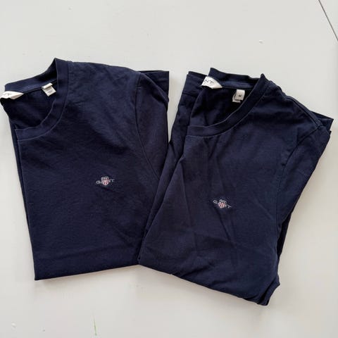 Selger en pakke med klær fra GANT, totalt fire plagg. Inneholder skjorte, genser (solgt), collagegenser og T-skjorte. Størrelse M og skjorten i 40.