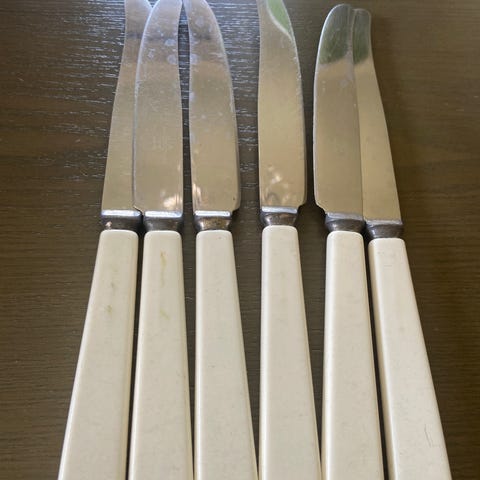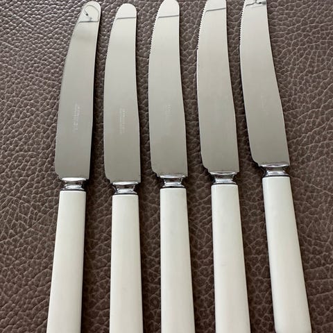 6 stk spisekniver i rustfritt stål og hvit plasthåndtak selges. Ukjent merke, men ligner i stil på Sheffield knivene. Lengden er ca 20,5 cm. Selges for 100,- pr stk. Evt 500,- for alle.