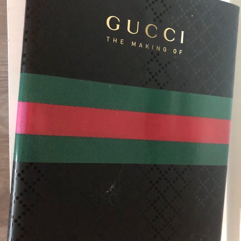 Gucci The Making Of bok med hardt omslag, svart farge med karakteristisk grønn og rød stripe. Inneholder informasjon om Gucci-merket og dets historie.