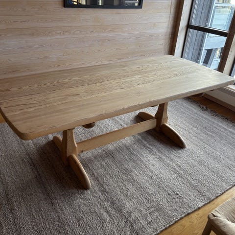 Nydelig spisebord i furu. Flott design, solid og godt håndverk. Avrundede hjørner, runde bein og en midtlegger under bordet (perfekt til å hvile beina på😊).