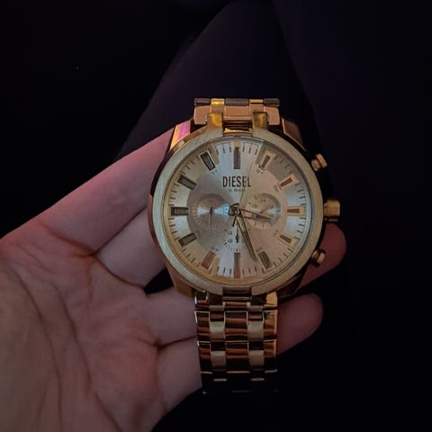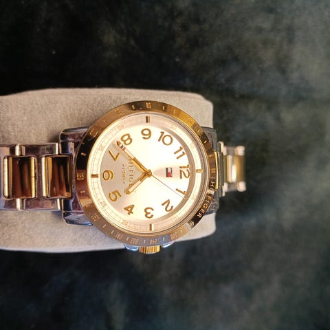 Tommy Hilfiger dame klokke med gullfarget metall lenke og hvit urskive. Klokken har flere funksjonelle småskiver. Leveres i original GiGi eske. Kjøpt i Italia :)