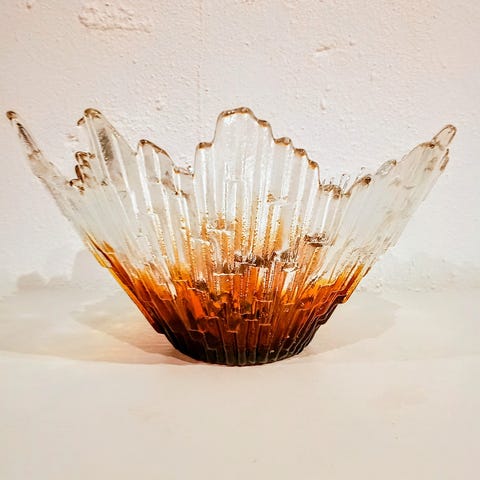 IITTALA, Finland - "Tuisku"-skål i klart glass av Valto Kokko. Uvanlig formet skål i klart glass i "Tuisku"-mønsteret designet for Iittala av glasskunstneren Valto Kokko. Designet på den sentrifugale støpte glassskålen minner om virvlende vann eller vind, og ble designet i 1978. Den var i produksjon fra 1979-1981, da den ble pensjonert. Denne vakre og allsidige skålen kan også brukes som vase eller vises frem alene som et kunstverk i glass. Den er et fint eksempel på moderne skandinavisk design. I veldig god stand uten avskallinger eller sprekker.