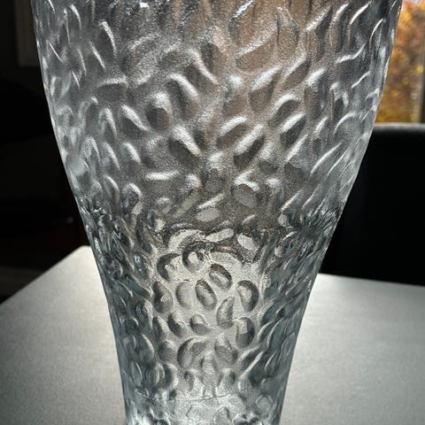 Mål: 13 cm høy. 19,5 cm diameter øverst. 7,5 cm diameter nederst. Vekt 1.067g.