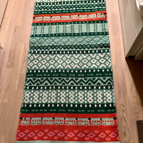 Vintage rustikk vevet brikke eller duk med dekorativt fiskemønster i beige og burgunder. Duken er vendbar og har motsatte farger på undersiden.