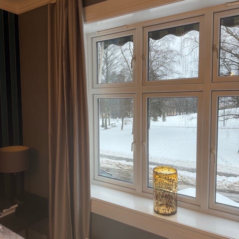 Nydelige gardiner i bomull, kjøpt og sydd hos Lothe og Motzfeldt i Drammen, usikker på hvem som er produsent.