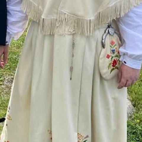 Bunaden har broderte elementer, knapper,perler og dekorative bånd