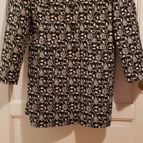 Elegant drakt i tykk silke (sannsynligvis, eller blandingsstoff, ingen anvisning finnes). Hvit bunn med originalt mønster av svarte sløyfer. Hvitt fór. Fra Yves Saint Laurent, "Made in France". I fin istand, skjørtet har kun en liten svakt gulaktig flekk. Ingen størrelse angitt, men: Jakken har rygglengde 65cm. Fine sorte knapper med gullkant. Rett skjørt med lengde 57 cm, livvidde 76 cm. To dype lommer, liten splitt midt bak.