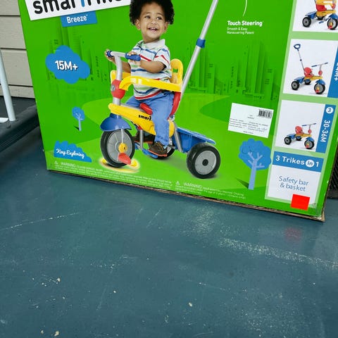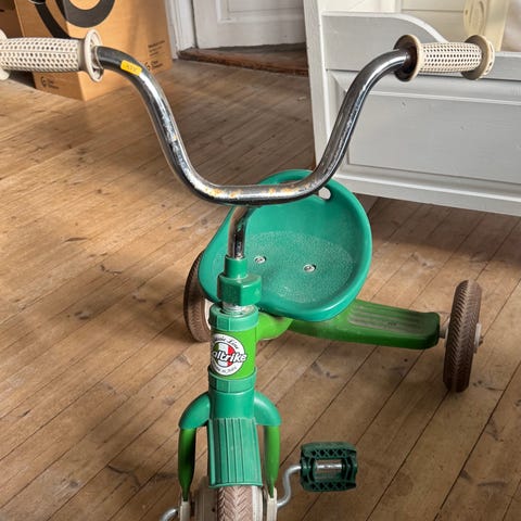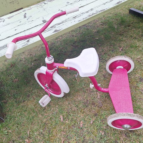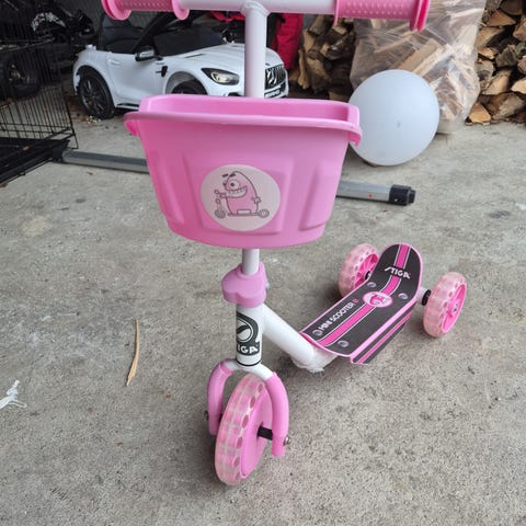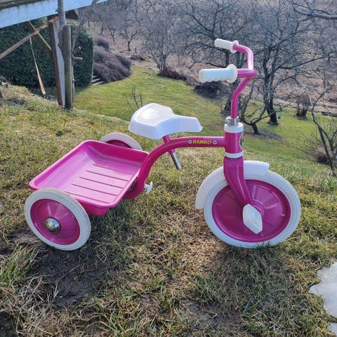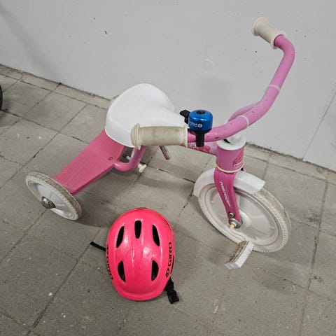 Sport barne tricycle med rosa og hvit farge. Tricyklen har tre hjul og pedaler foran. Den er laget med solide materialer og har et sete som gir støtte for små barn. Passer for barn som lærer å sykle med ekstra balanse og støtte.