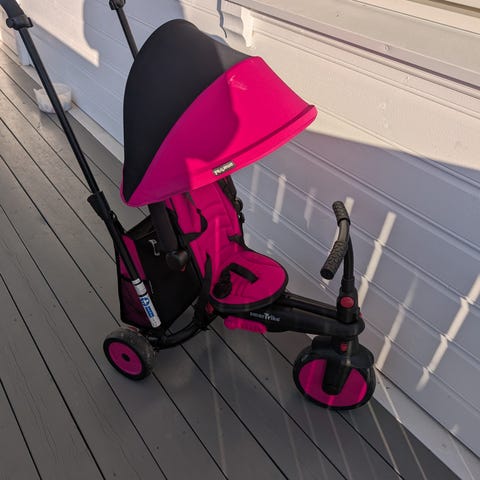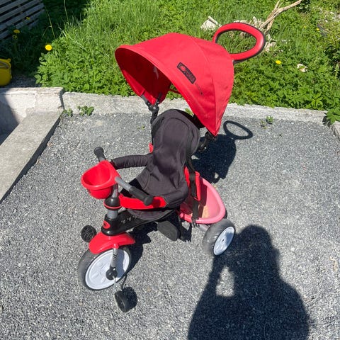 Fin trehjulssykkel med justerbart foreldrehåndtak, slik at du som forelder kan styre (eller nødstoppe) om ønskelig. Perfekt for barn som ønsker å lære å sykle.