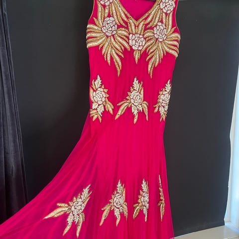 Selger en vakker kjole uten ermer, med store glitrende krystaller og steiner på overdelen.