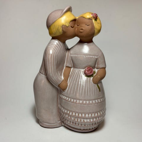 To svært sjarmerende små figurer i keramikk. Jeg vet ikke hvem som har laget dem, men det er en mann og kone laget i terracotta, med blå og hvite klær, hvitt hår og skjegg, blank glasur. Hun holder en kost og en bøtte i hendene. Ingen skader, nagg eller bruksspor. Ingen merking eller signatur. Dame: Høyde 6 cm. Bredde 4,5 cm. Dybde 3 cm. Mann: Høyde 6 cm. Bredde 3,5 cm. Dybde 3 cm. Samlet vekt: 60 g.