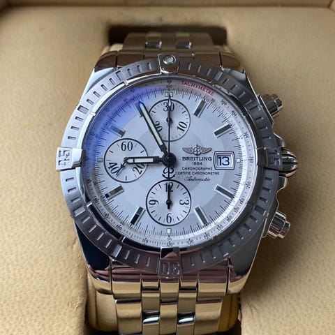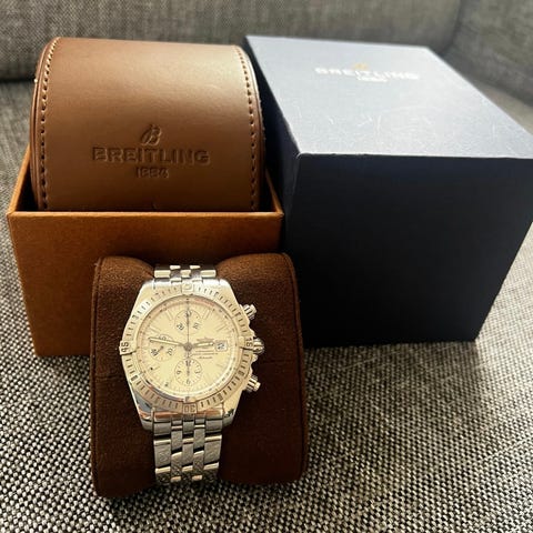 Breitling Chronomat 39mm Ref. 13352. Klokken er produsert en gang mellom 2001-2004, og fremstår som pent tatt vare på. Den kommer med kun orginaldeler, men uten orginal boks og papirer.