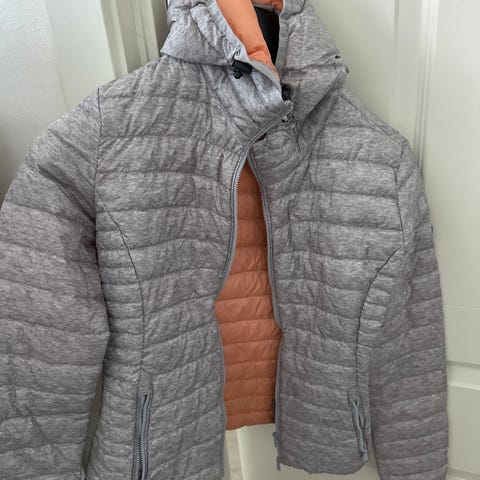 Lett dunjakke i str M (passe best til S). Kan vrenges, lys gråmelert på den ene siden og orange på den andre siden. To jakker i en 😊
