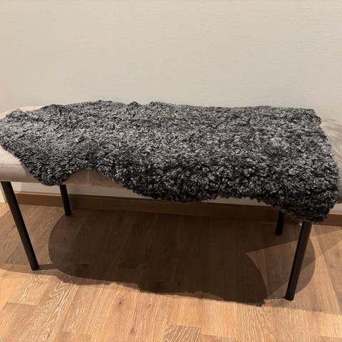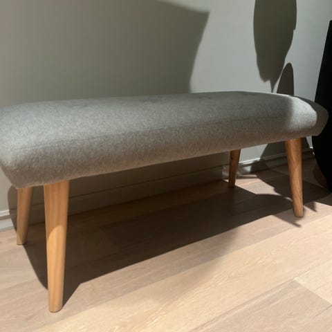 Nydelig, fin liten benk i lilla ullsoff. Behagelig og varmt sittemøbel.