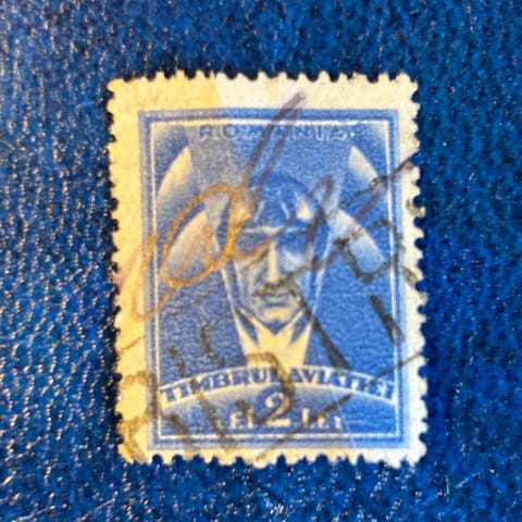 2# Frimerket på bildet er et ungarsk flypostfrimerke fra serien "Fly", utgitt i 1931 for å feire den første flyvningen mellom Budapest og Helsinki. Frimerket har en verdi på 20 fillér (f) og viser et fly som flyr over et landskap. Det er kjent som "Legiposta Helsinki".