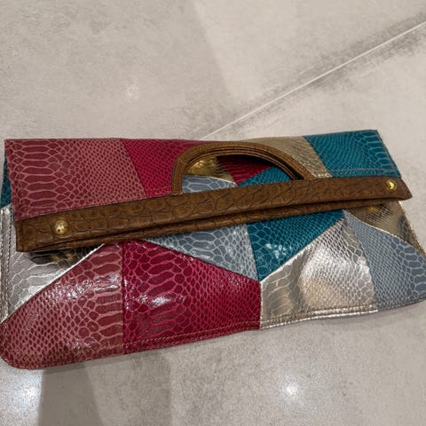Flere rom innvendig med plass til kort, sedler og mobil. Avtagbar håndreim.