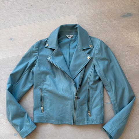 Jakken har glidelåslukking foran, glidelåsdetaljer på ermene og en myk, semsket overflate. Kul jakke til å feks ha over kjoler!