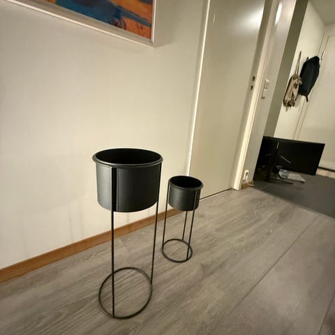 Plantepotte i svart metall med støtte