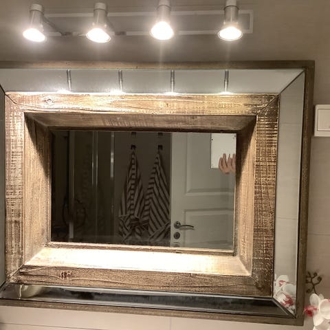 Sett bestående av speil med treverk, en sto dobbel hylle, 3 småhyller og en tau til oppheng selges