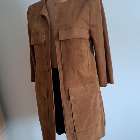 Vinter Kåpe i størrelse S, hvit farge. Laget av mykt og fluffy materiale, designet for kvinner. Kåpen har dobbeltradet knappelukking og er foret på innsiden.