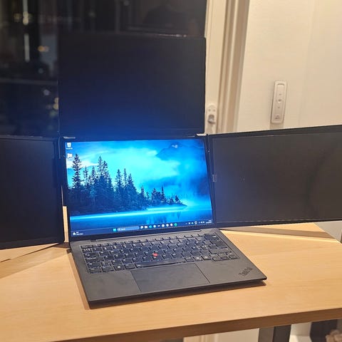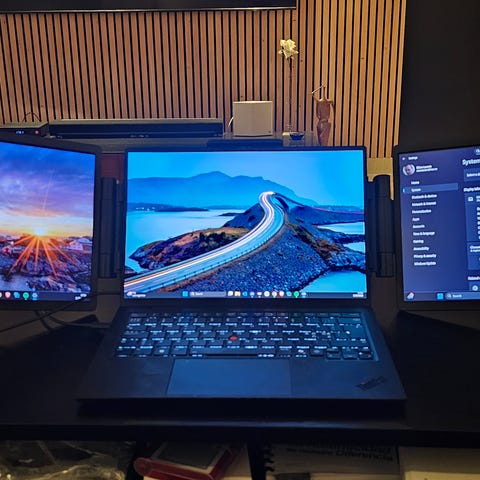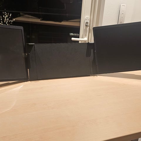 Triple Screen Laptop Skjermutvidelse med tre skjermer, designet for å utvide skjermarealet for bærbare datamaskiner. Passer til 14-18 tommers bærbare PC-er. Produktet består av to skjermer som kan monteres rundt en bærbar datamaskin for økt arbeidsflate og forbedret produktivitet.