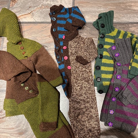 Svigerinnen min har sort belte i strikking og sammen med svigermor har de skjemt bort tvillingene våres opp gjennom åren med nydelige hjemmestrikkede klær. Vakkert håndverk, formue av garn og utallige arbeidstimer. Jeg syns det er veldig vanskelig å både prise dette og la det forsvinne men har dessverre ikke plass å spare det lenger.