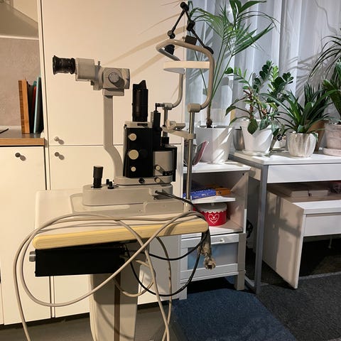 Dette er en Topcon SL-2E-V spaltelampe, et sentralt diagnostisk instrument brukt av øyeleger og optikere for å undersøke fremre og bakre segment av øyet.