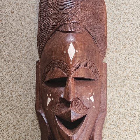 Masken i bildet ser ut til å være en tradisjonell afrikansk utskåret maske. Den er laget av tre og har detaljerte utskjæringer som representerer ansiktstrekk og hår.
