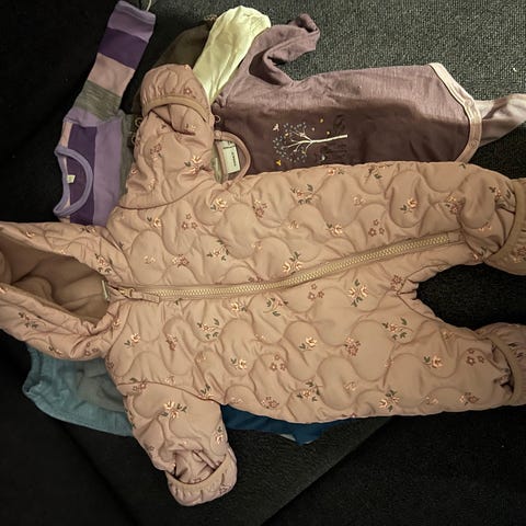 Super vindtett heldress. Klaffer på ermer og ben som kan foldes over babyens hender/ føtter.