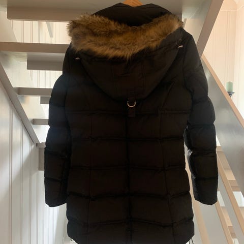 Flott og varm dunjakke, ubrukt. Kan ta av armene, slik at det blir vest. Avtagbar pels. Innsvinget.