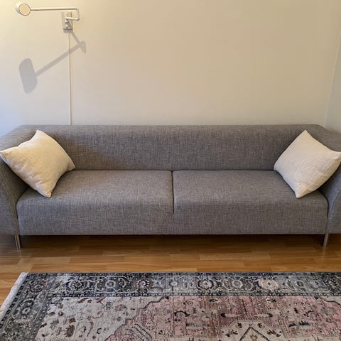Pent brukt sofa fra Bolia med tilhørende puff. Sofaen har blitt litt misfarget på baksiden, Ellers er stoffet helt og fint, ingen flekker det jeg kan se.