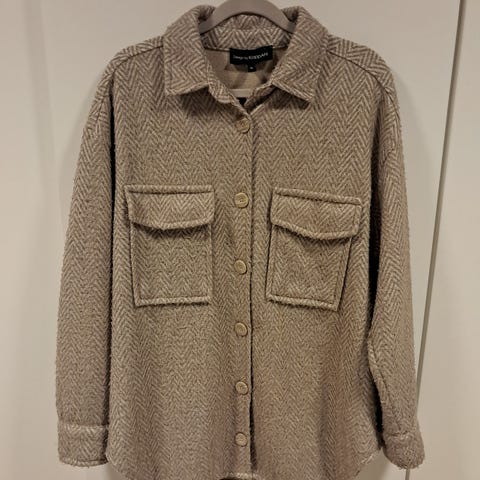 KappAhl jakke i ullblanding. Str. small. Jakken er beige/taupe farge og har en enkel design med knappelukking og to store lommer foran. Egnet for hverdagsbruk. Nypris 1000, selges for 200 eller bud.