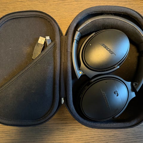 Bose-hodetelefoner med tilhørende bæreveske. Hodetelefonene er hvite med polstrede øreputer og justerbar hodebøyle. Bærevesken er hard og beskyttende med Bose-logo på toppen.